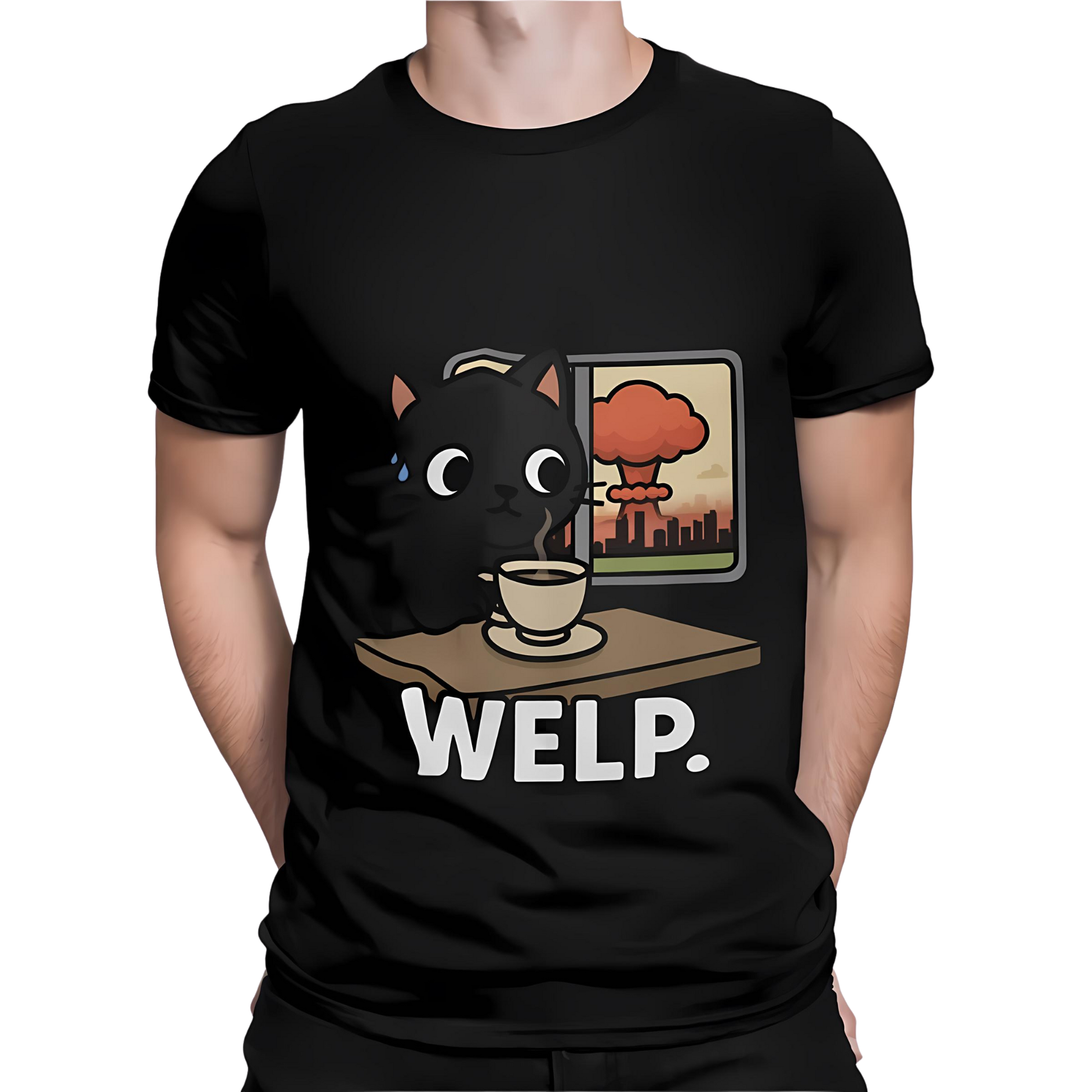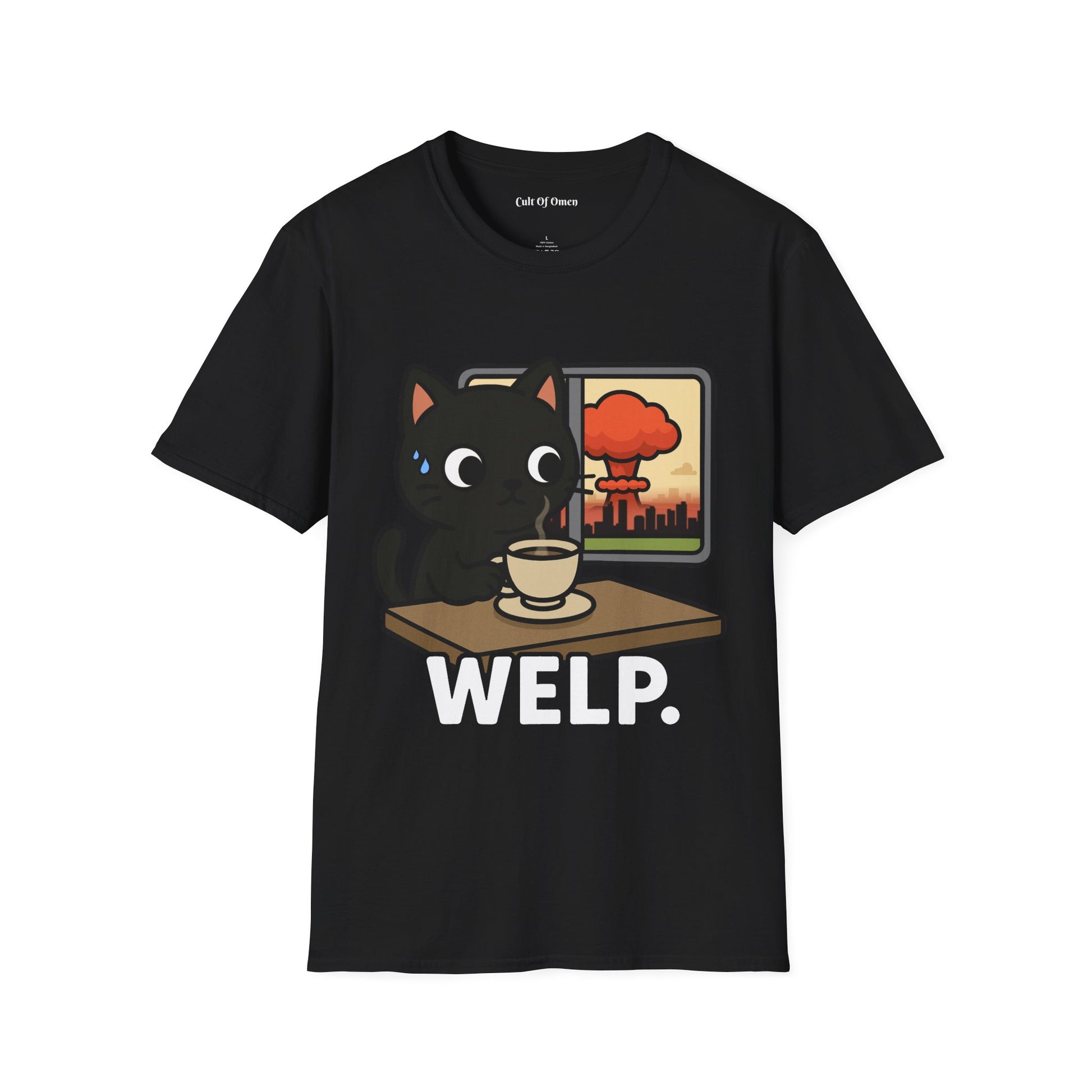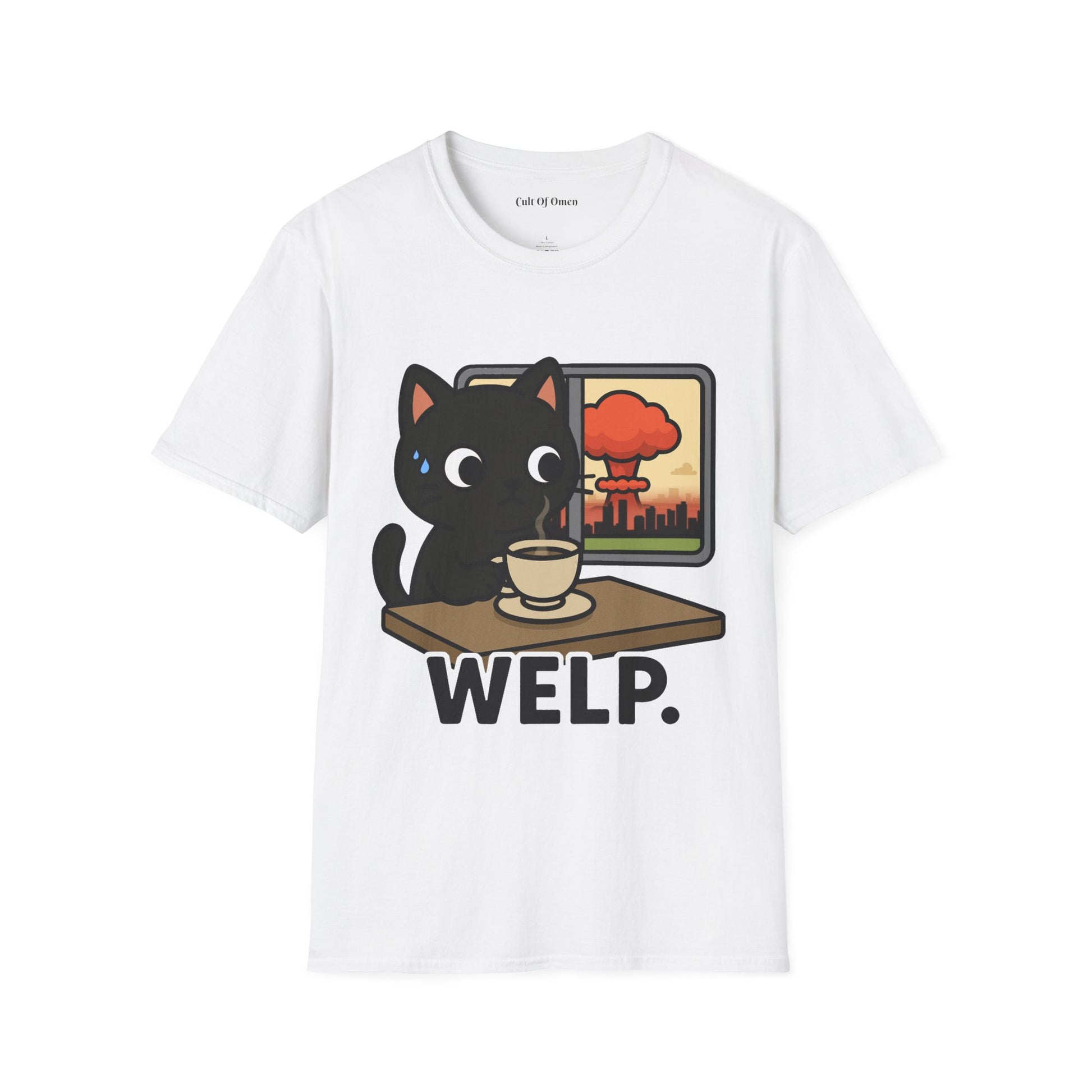 This tee features our signature black cat staring blankly as the world (literally) explodes in the background. Calm? Maybe. Concerned? A little. Emotionally available? Absolutely not.