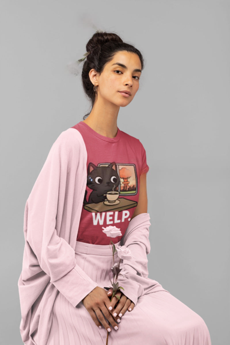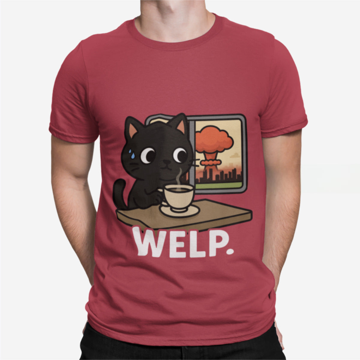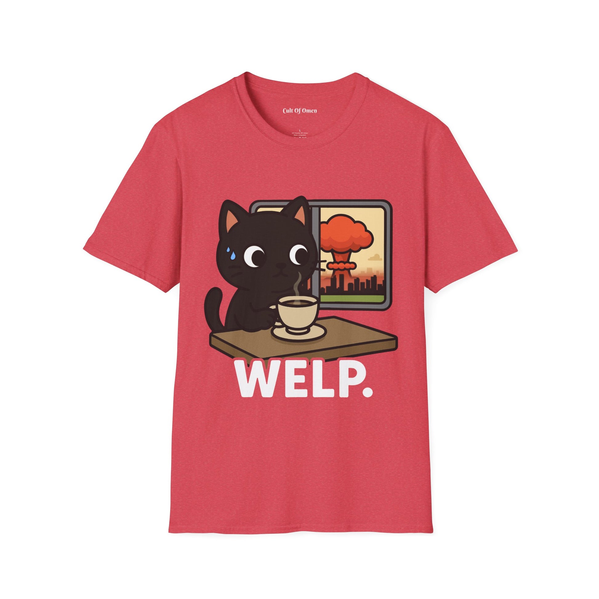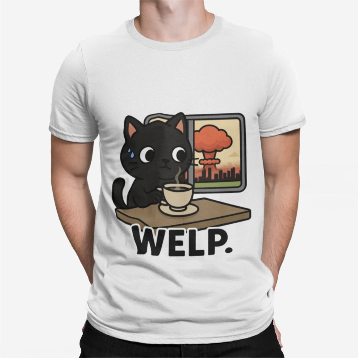 This tee features our signature black cat staring blankly as the world (literally) explodes in the background. Calm? Maybe. Concerned? A little. Emotionally available? Absolutely not.